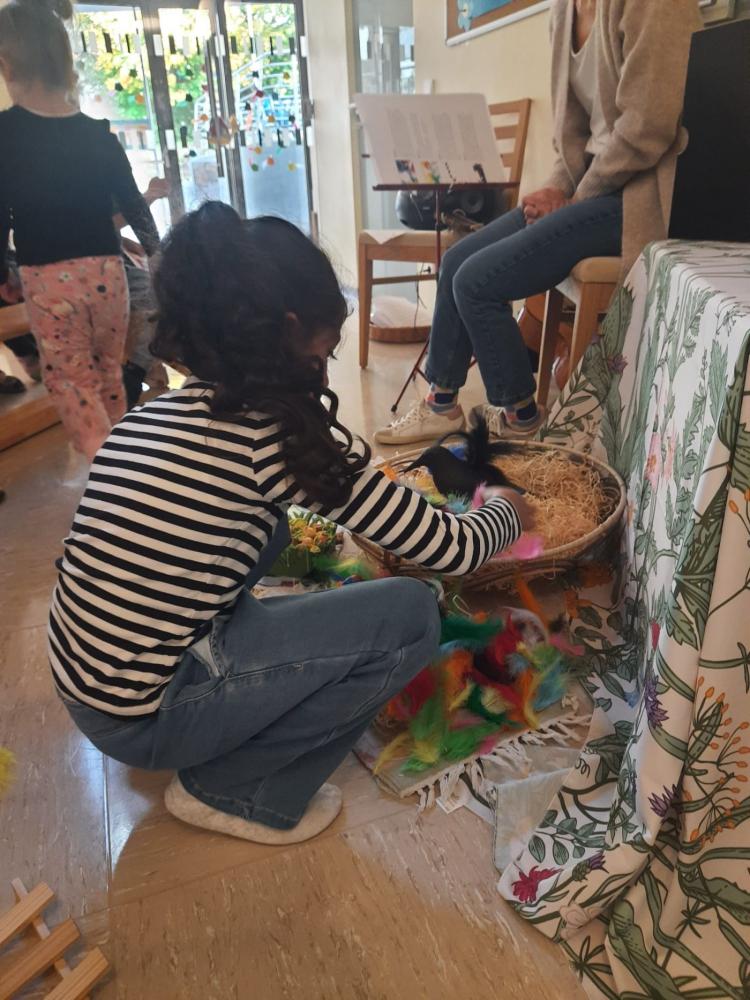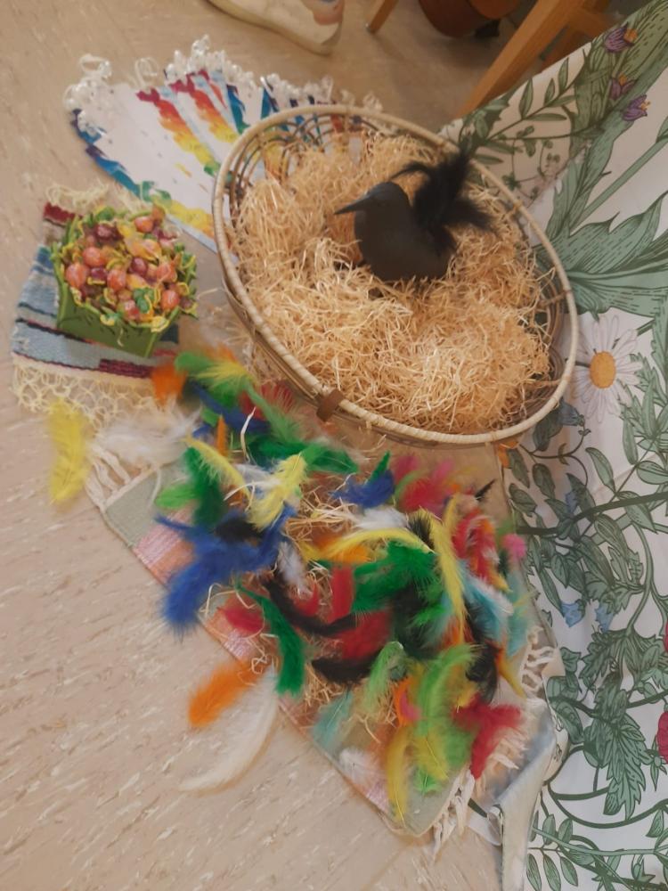 Nach der Geschichte überlegten wir, was uns selber bunt macht, schmückten den immer noch düster dreinschauenden Raben mit bunten Federn und erzählten ihm, was uns besonders macht.