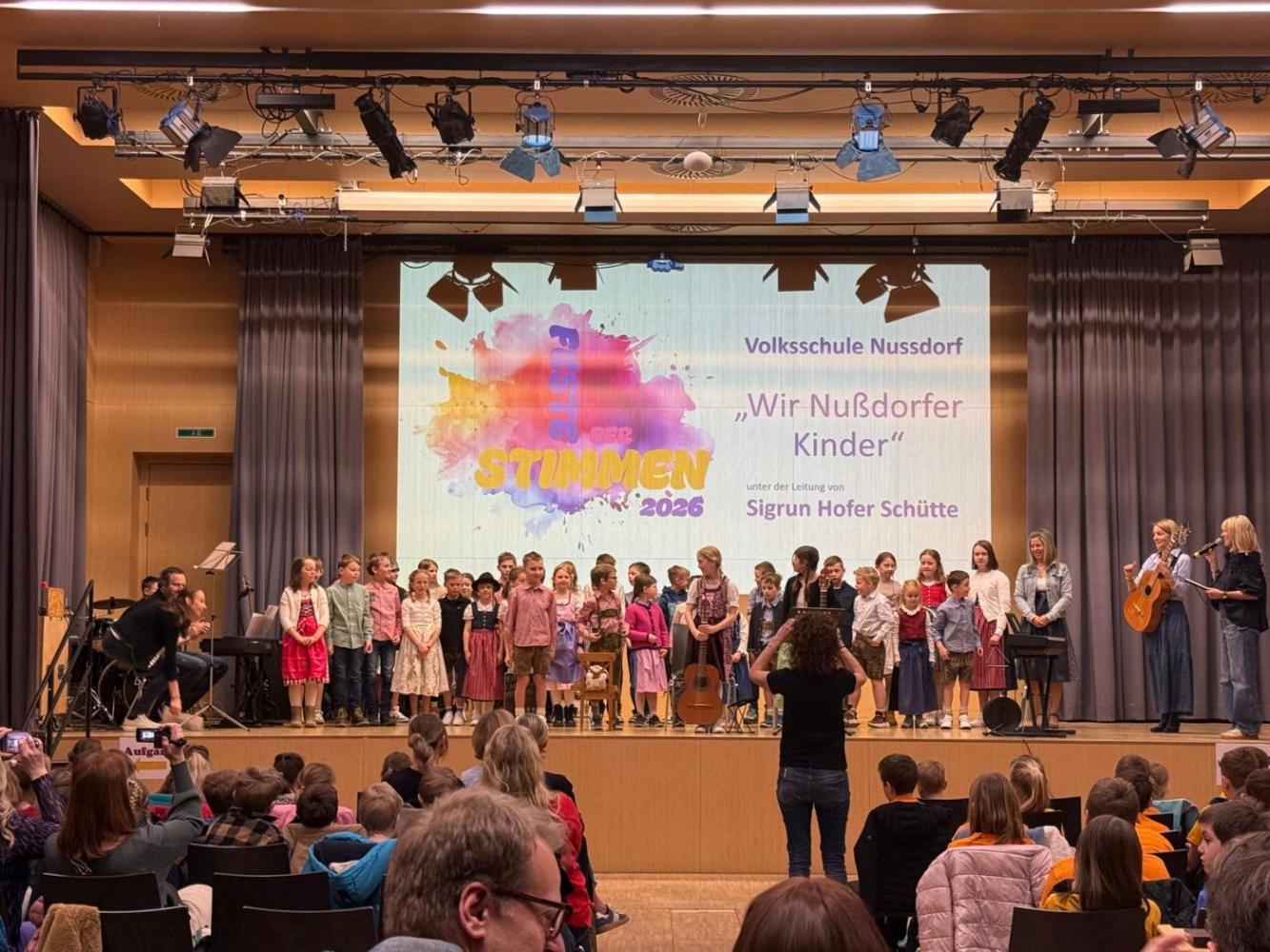 Am 25. März 2026 wurde das Fest der Stimmen 2026 im Kultursaal Debant zu einem eindrucksvollen musikalischen Erlebnis. Bereits ab 9:00 Uhr versammelten sich zahlreiche Kinder- und Jugendchöre aus ganz Osttirol, darunter auch die Volksschule Nußdorf, um ihr Können zu präsentieren und die Bühne mit Leben zu füllen. Wir, die Volksschule Nußdorf, trugen unsere Schulhymne " Wir Nußdorfer Kinder" vor. Begleitet wurden wir von unseren zwei Gitarristinnen Amelie und Mia, am Cajon von Lukas und am Xylophon von Ben.